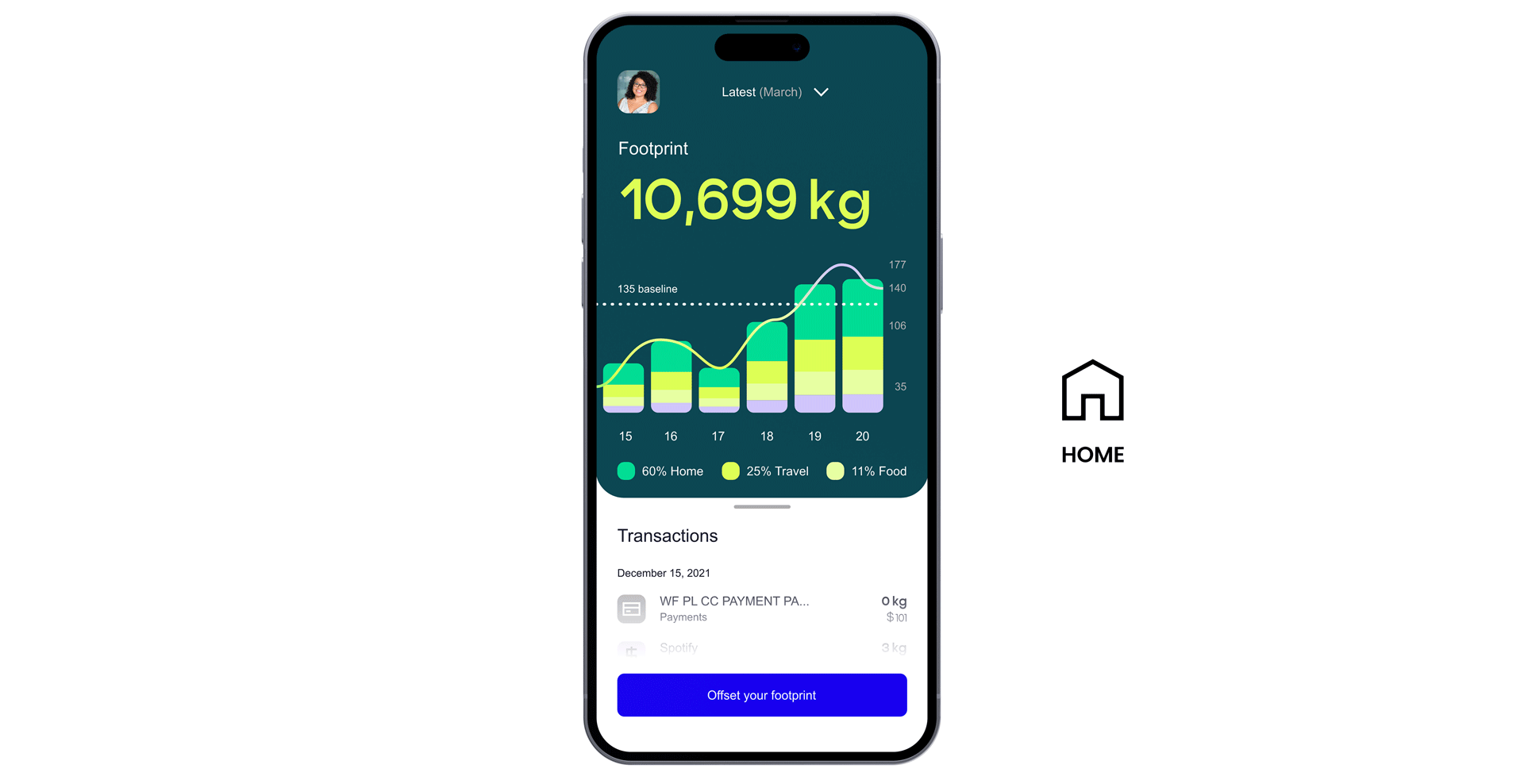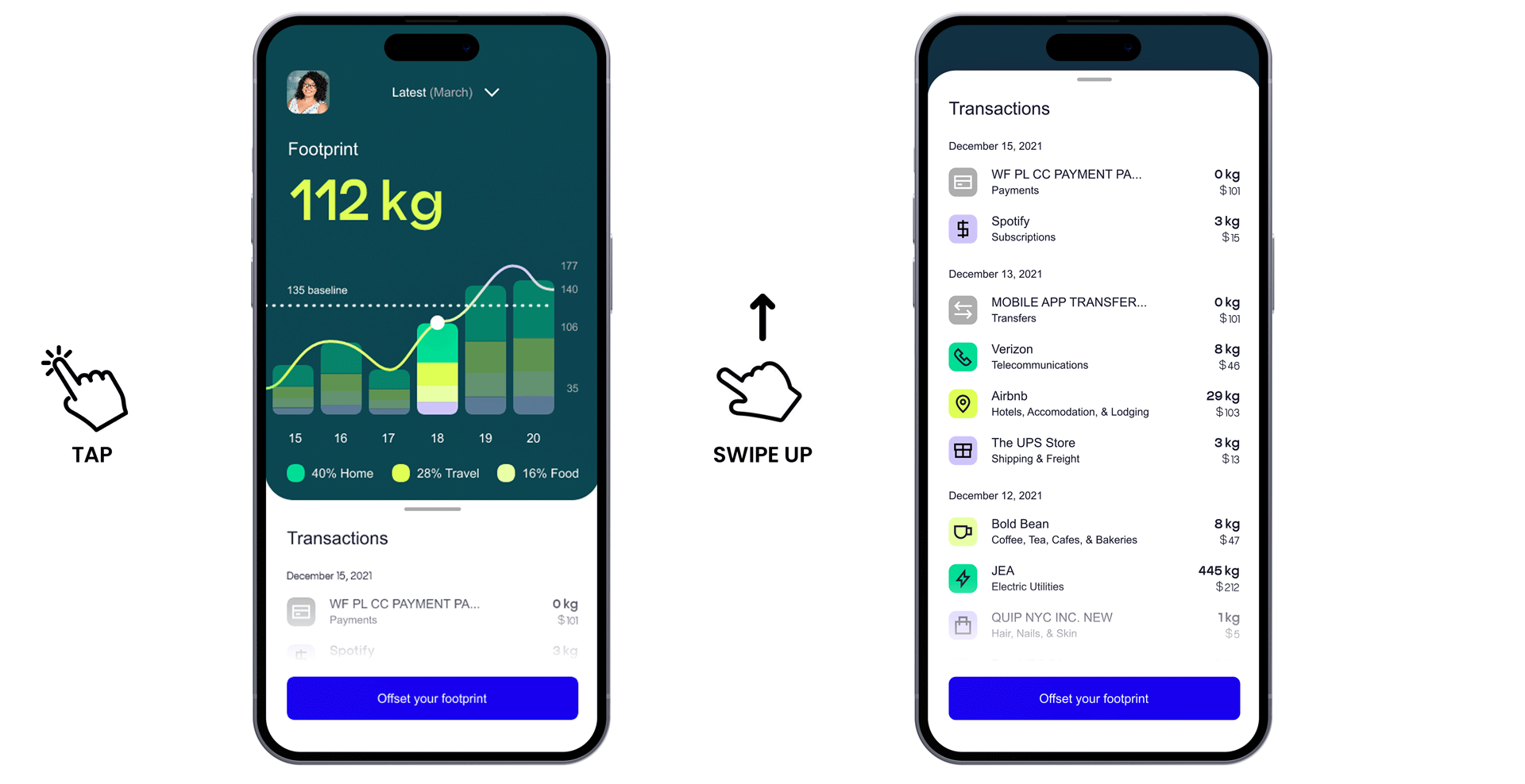 As a user, now that I know my carbon footprint, how can I offset it? Balancely partners with a portfolio of climate projects that are actively working to remove, and reduce carbon from the atmosphere. User are able to offset their carbon footprint by donating to this portfolio. A user is able to offset their footprint any time by tapping on the "Offset your footprint" button located at the bottom of any screen. This drives the user to eventually offset their footprint once they're ready.