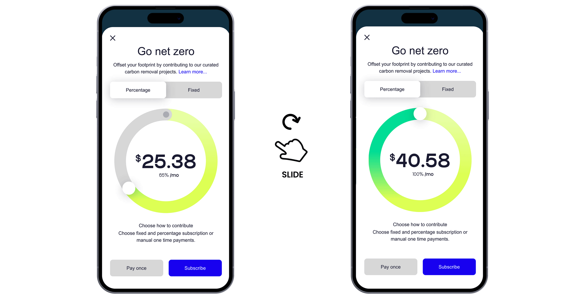 Once clicked, the user has the ability to choose whether to offset a percentage of their carbon footprint or offset a fixed dollar amount. Users can use the slider wheel in order to control the amount. Finally, users are able to choose whether to offset their footprint once or to subscribe to offset their footprint monthly based on the amount they have chosen.