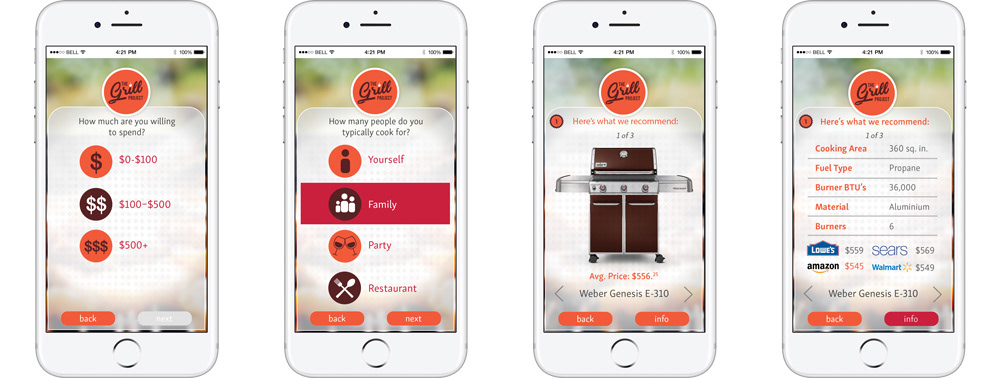 The Grill Project is a recommendation engine that helps novice grill consumers choose the right grill that fits their situations and needs through a series of questions.