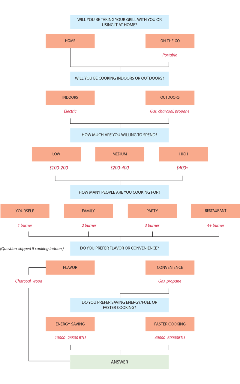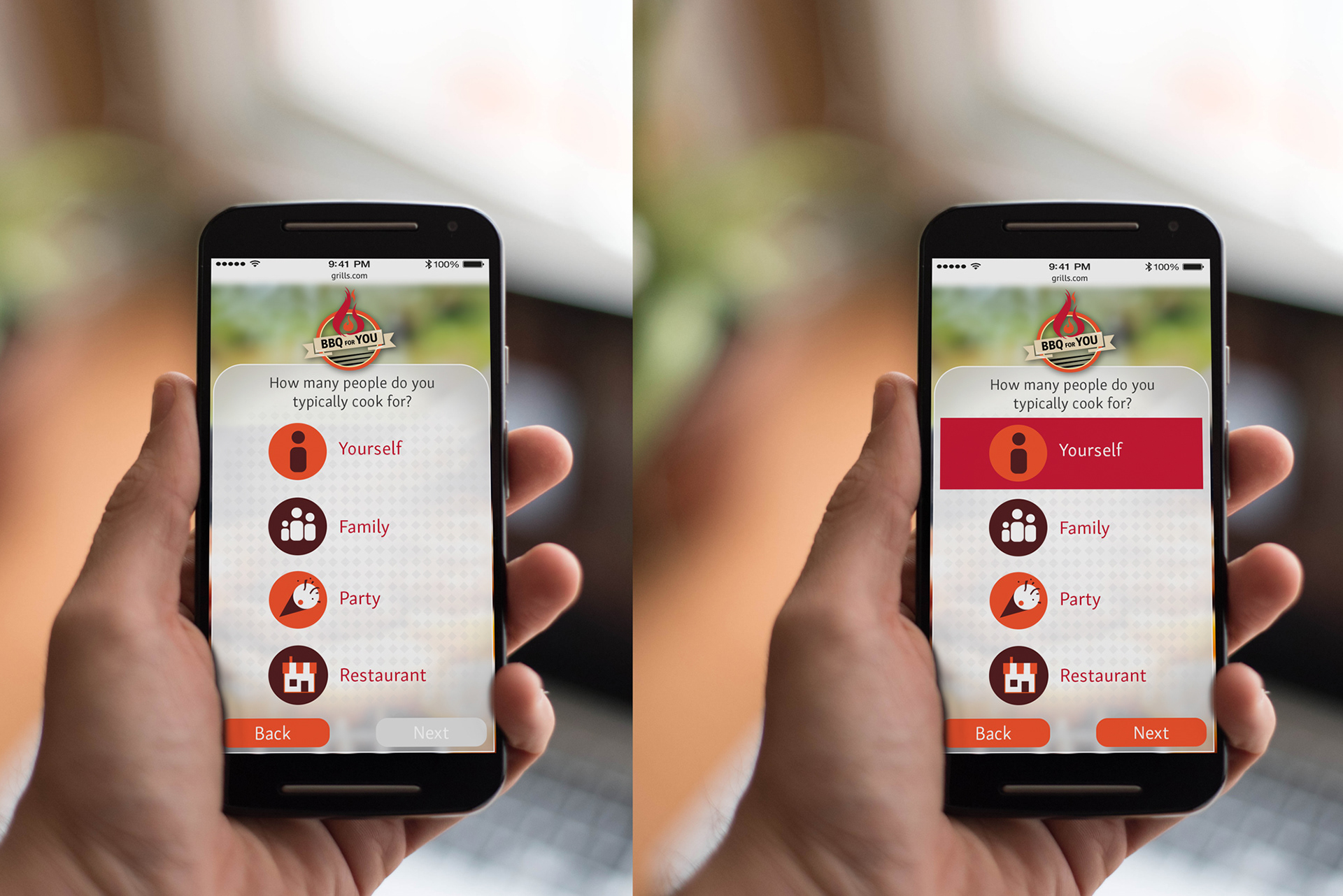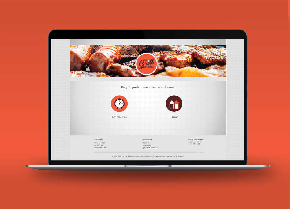 As a first time grill consumer, the process of understanding all the technical details of a grill and what will work best for me can be daunting. The Grill Project's recommendation engine brings a casual experience to picking a new grill by presenting questions that are easy for anyone to follow and avoid all the technical details and aspects of grills. The user simply answers the questions and the engine associates each answer with predetermined results that will help narrow their choices at the end.