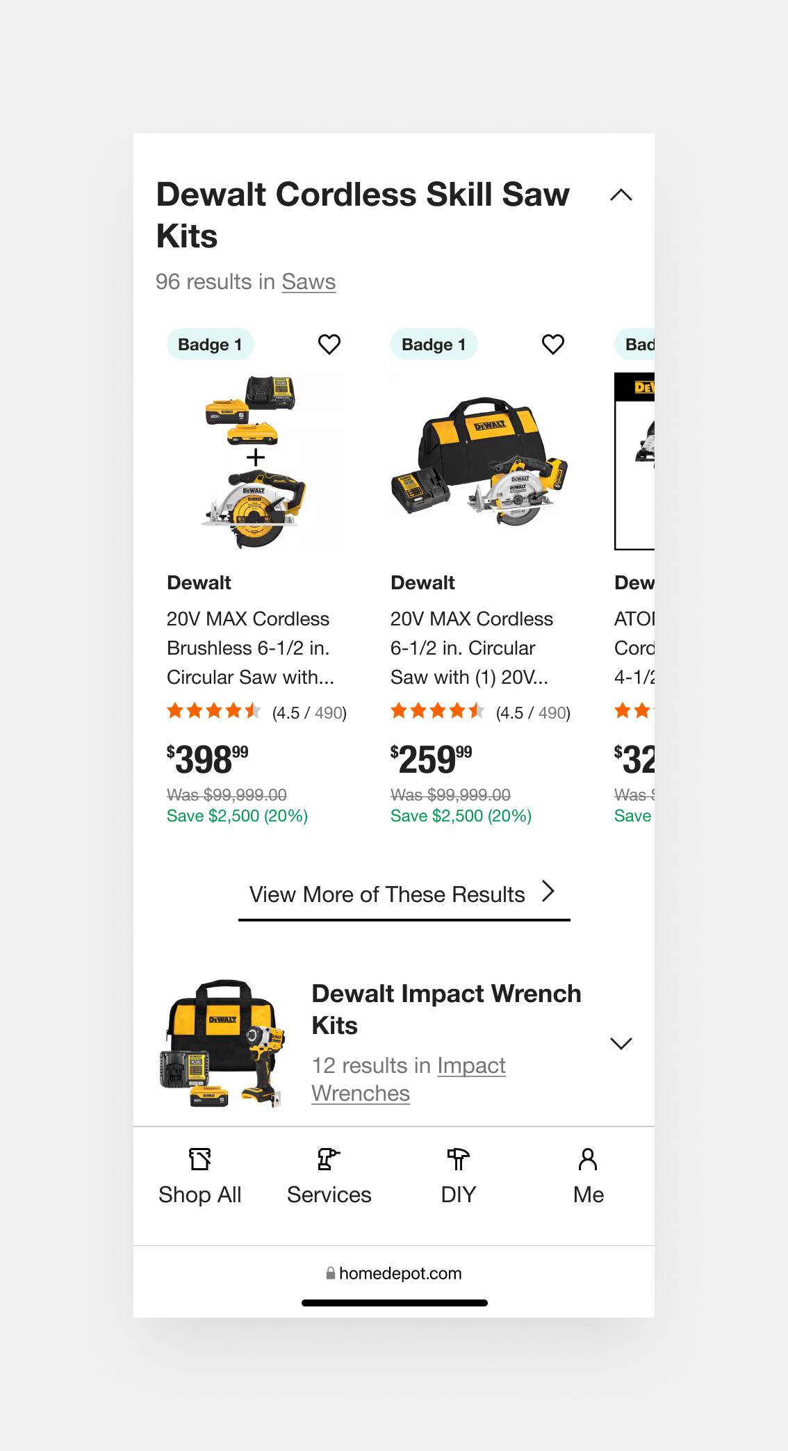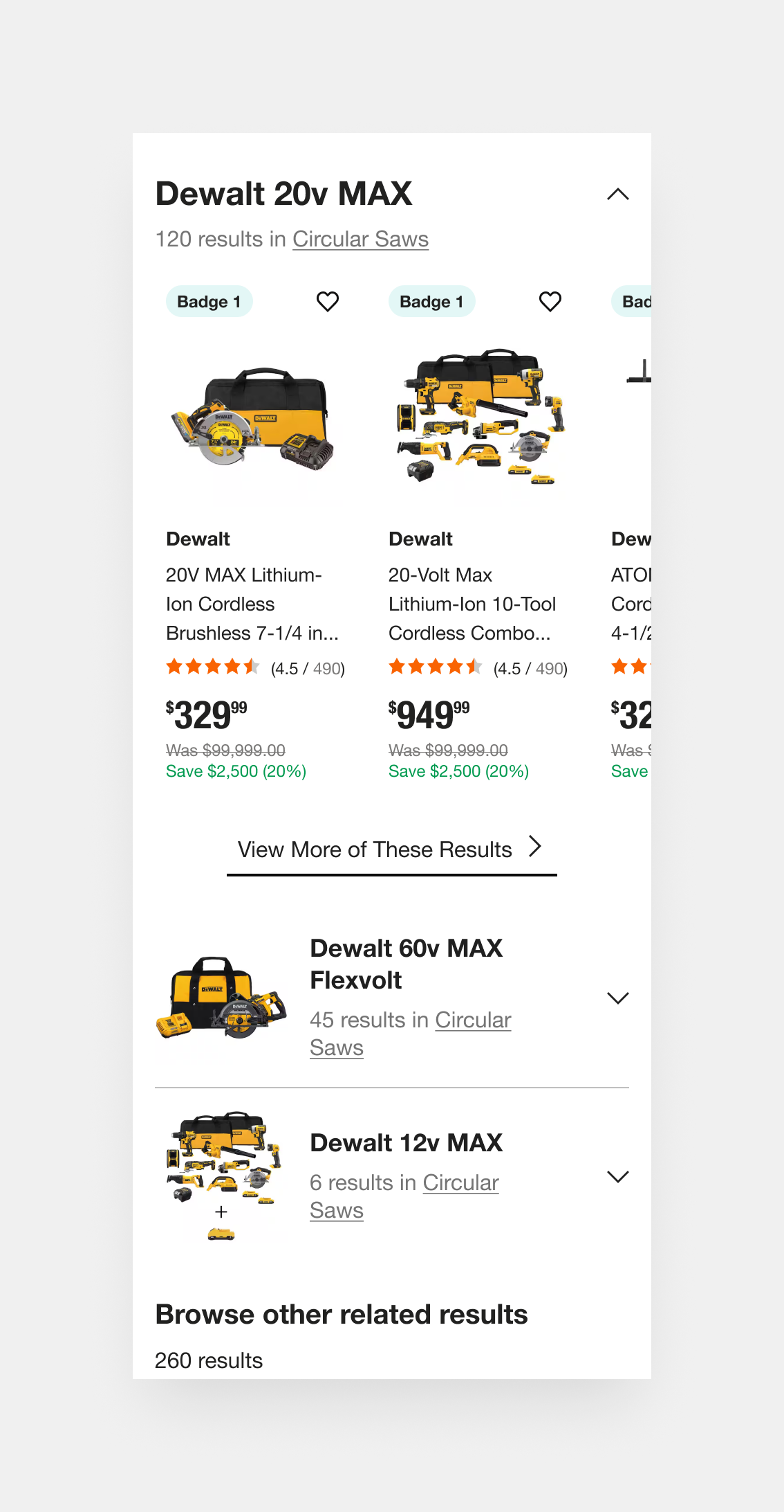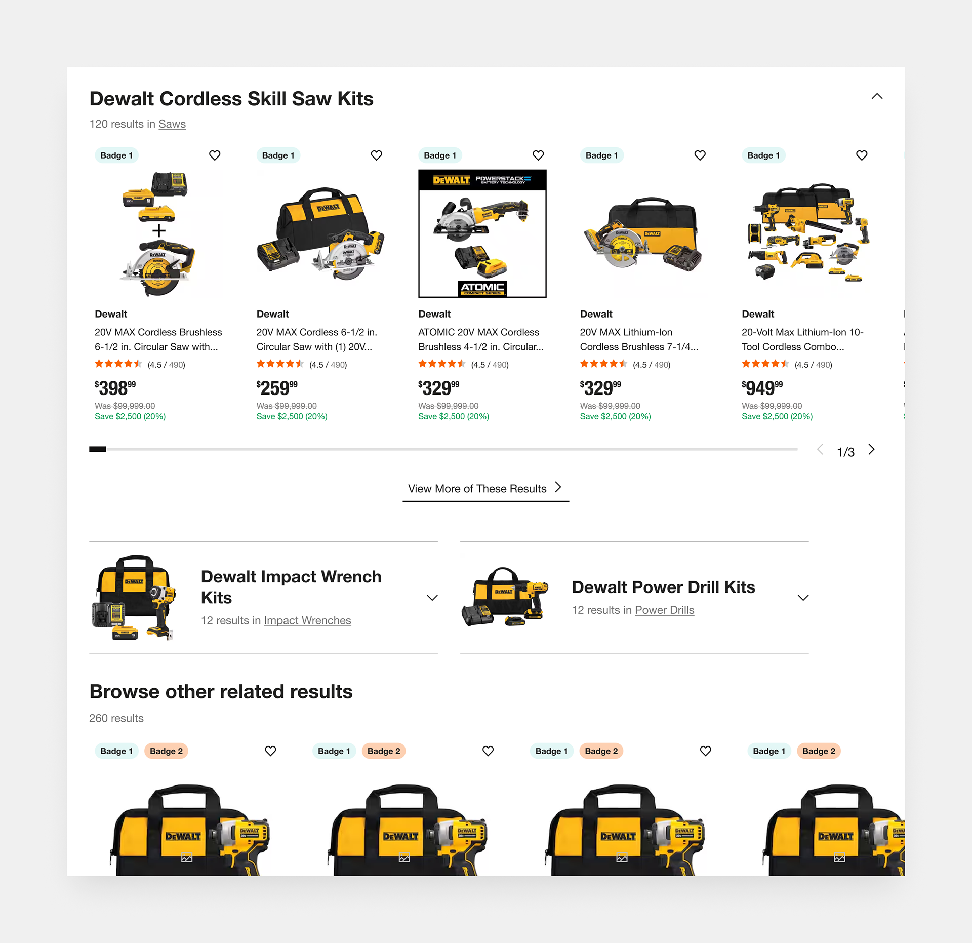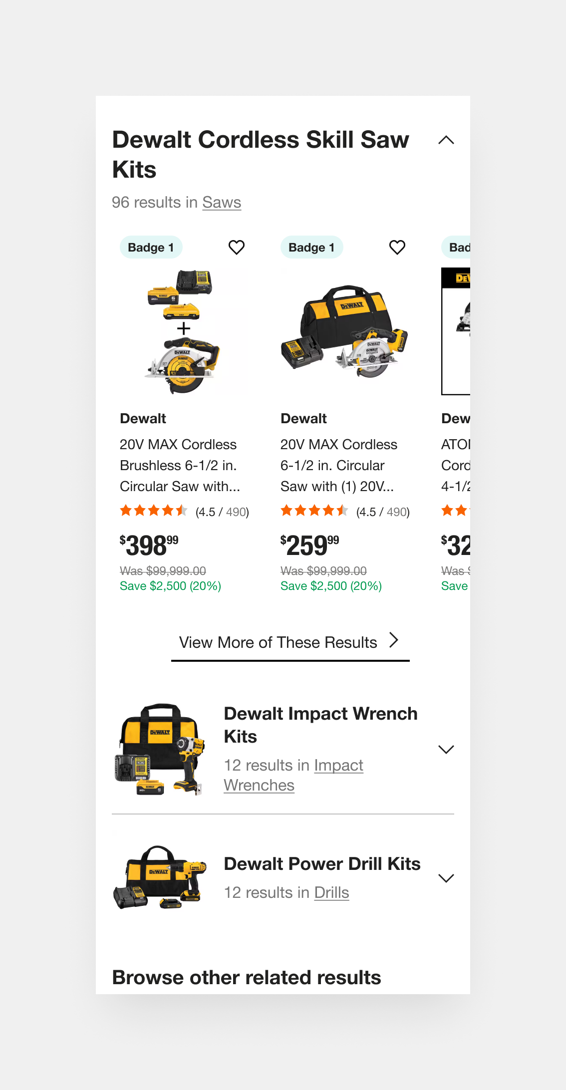 Dynamic categories, such as “Cordless Skill Saw Kits” or “Impact Wrench Kits,” anticipate user needs by organizing fuzzy results around product intent and use case. This surfacing of curated subsets encourages exploration, especially when exact matches fall short, and supports different buying paths (e.g., someone who doesn’t know the exact name of the tool but knows the job they need it for).