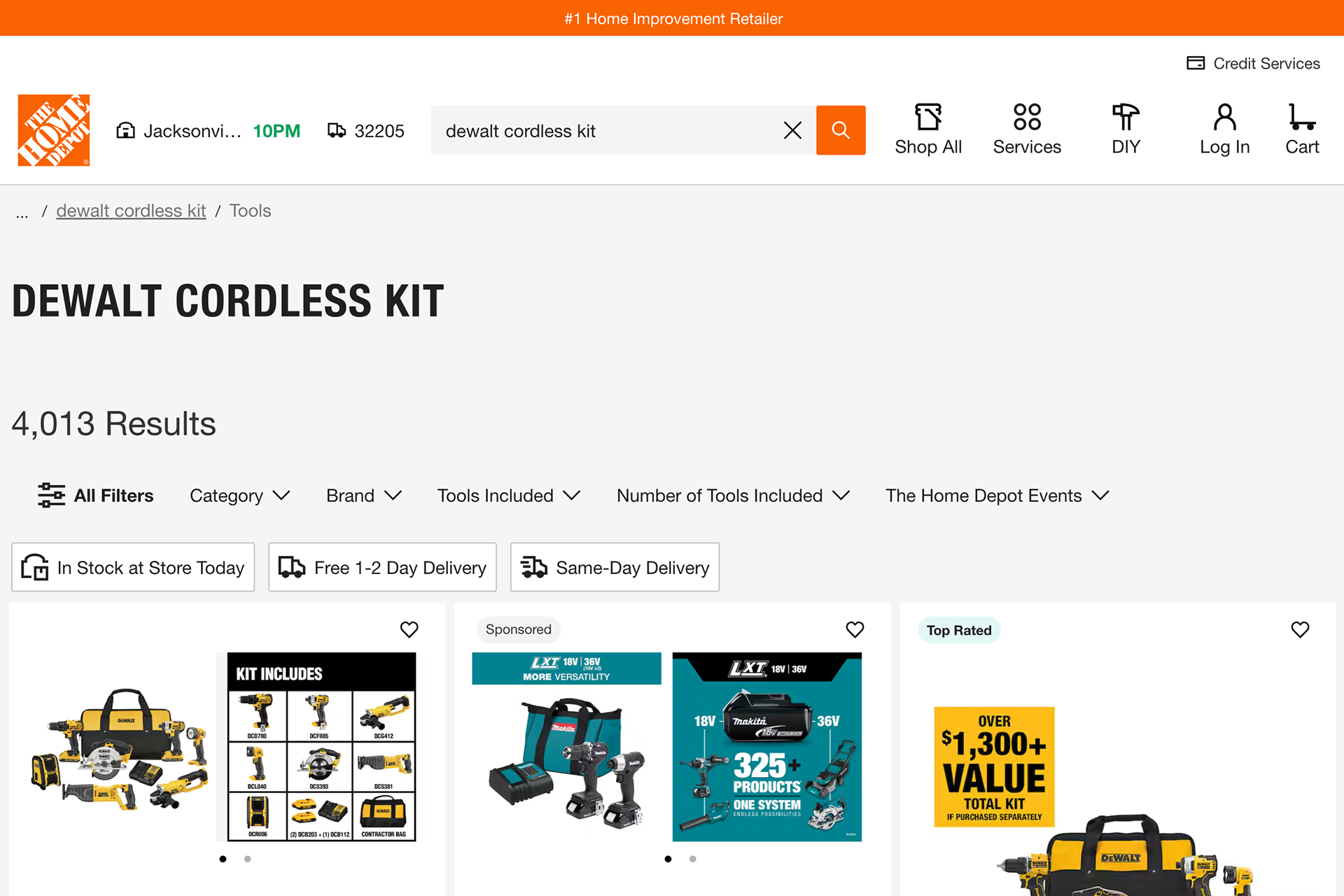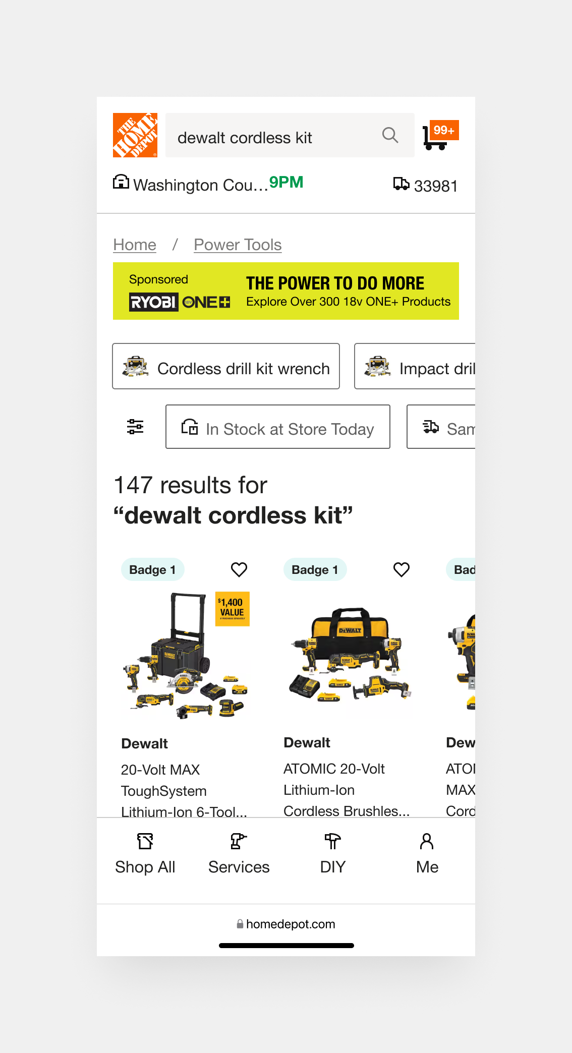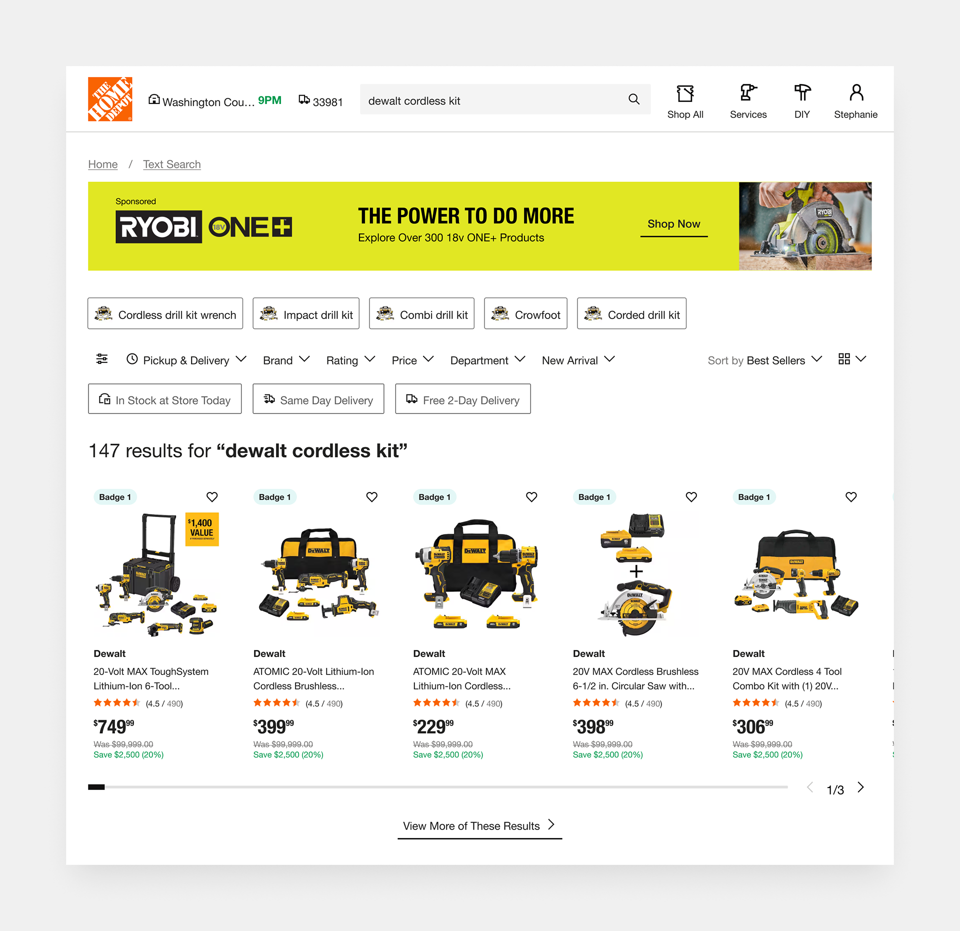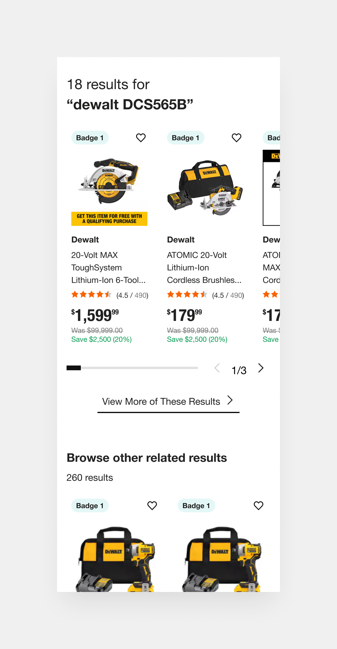 Dynamic categories, such as “Cordless Skill Saw Kits” or “Impact Wrench Kits,” anticipate user needs by organizing fuzzy results around product intent and use case. This surfacing of curated subsets encourages exploration, especially when exact matches fall short, and supports different buying paths (e.g., someone who doesn’t know the exact name of the tool but knows the job they need it for).